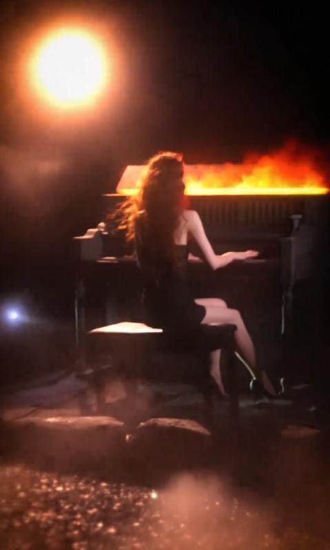 之后随着画面一转,整个场景的色调变得暗了下来,在画面中戚薇坐在钢琴前面,钢琴上和场景上方有一点“落日余晖”的感觉,