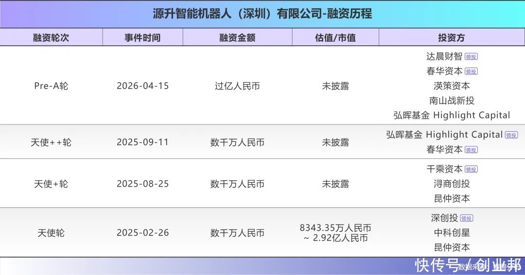成立短短一年,源升智能就已完成5轮融资,累计融资金额达数亿元。4月15日,源升智能宣布完成上亿元Pre-A轮融资,本轮融资由达晨财智、老股东春华创投共同领投,渶策资本、南山战新投跟投,老股东弘晖基金超额跟投。