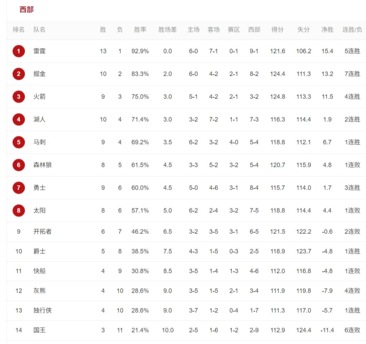 今天结束的其他比赛 独行侠加时138-133力克开拓者,快船118-121不敌凯尔特人,太阳122-124不敌老鹰,爵士队150-147险胜公牛,目前雷霆队继续排名西部第一,火箭队暂列西部第三,勇士队拿到客场三连胜后排名来到西部第七,快船队目前只排名西部第十一