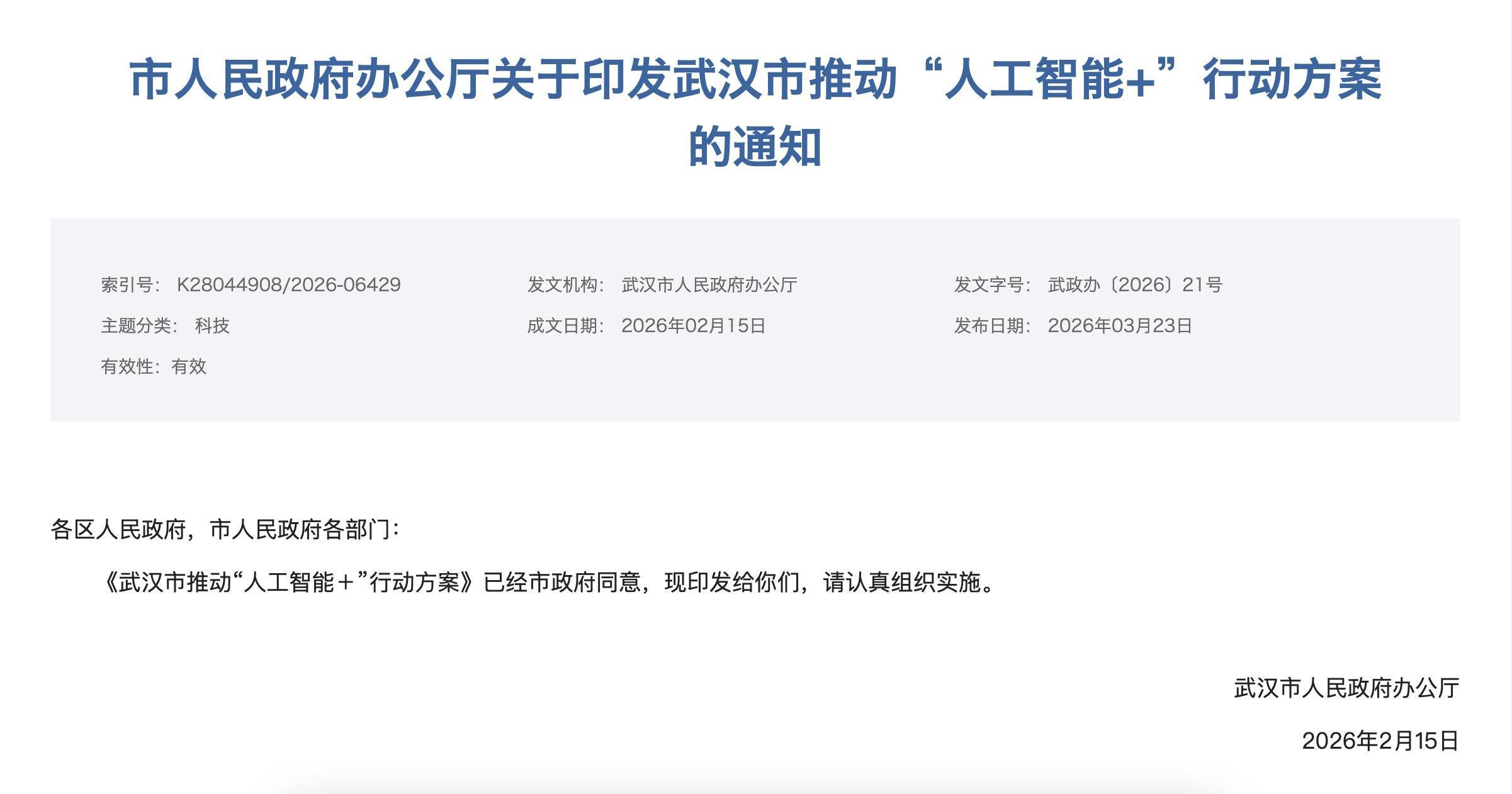 “智治赋能”工程包括两个方面。“人工智能+”社会治理方面,推进市政公共设施智能化改造升级,加强道路、桥隧的智能化监测维护,优化事件智能发现大模型及“城运人工智能助手”,增强事件感知、预警、处置能力,提升“一网统管”智能化水平,加快人工智能在公共资源招投标中的应用,推动公共数据合规共享,建设国土空间规划实施监测网络,深化智能终端在交通指挥、固定线路巡逻、排爆、危化品处置、防火巡查、应急救援等场景应用,推动人工智能赋能网络空间治理,支持东湖高新区低空共享无人机应用示范区建设,支持江岸区、江汉区分别探索建设人工智能赋能智慧交通、智慧物业新模式,到2028年底打造30个社会治理智能体。
