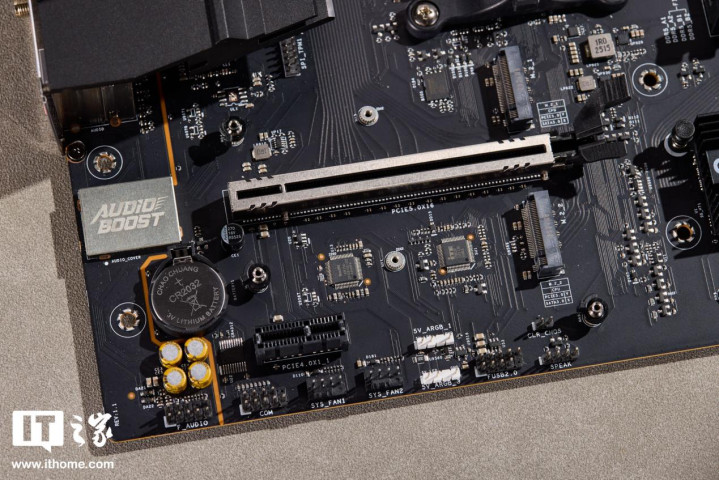 CPU下方提供1条带有铝合金加固的PCIe5.0x16显卡插槽,上下各有1条PCIe5.0M.2插槽,再下方还有1条PCIe4.0x1插槽,支持连接声卡等扩展件。右侧最下方还有第3条PCIe4.0规格的M.2插槽,同时还保留了4个SATA接口,存储扩展性到位。