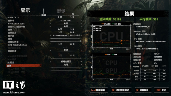 在经典动作冒险游戏《古墓丽影:暗影》中,选择1080P分辨率+最高画质预设,运行游戏自带基准测试,游戏平均帧数为381帧。