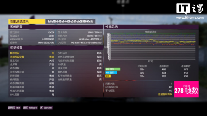 第四款游戏《极限竞速:地平线5》,以1080P分辨率+极端画质预设,运行游戏自带基准测试,游戏平均帧数为278帧。