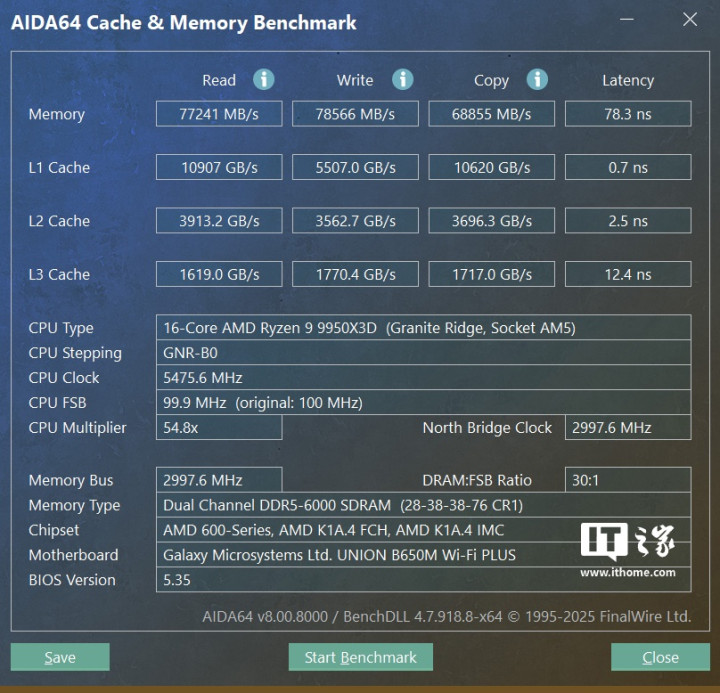 这个成绩非常均衡,尤其是内存拷贝速度和内存延迟表现都比较优秀,看来影驰联盟B650MWi-Fi黑武士PLUS主板对于内存性能的优化相当到位。其实这块主板最高支持7600+MT/s的内存频率,因此内存超频的潜力也非常大,只不过AMD平台这边6000MHz依旧是内存频率的甜蜜点,因此超频部分就不再做具体展示了。