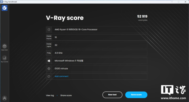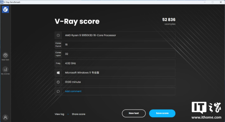 锐龙99950X3D处理器默频模式下渲染分数为52836分;