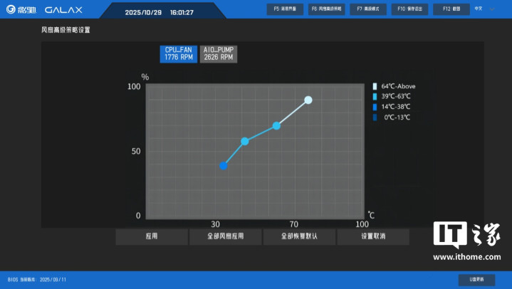 风扇高级策略中提供了每个风扇的速度曲线精细化调节,并提供一键恢复默认和一键取消设置选项。