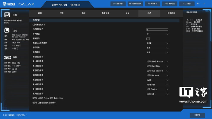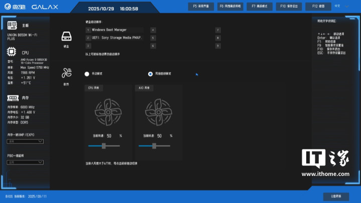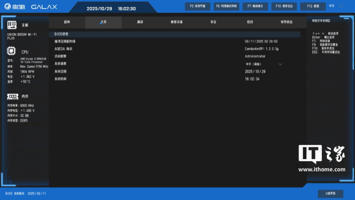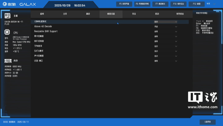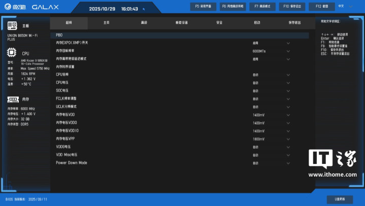 影驰联盟B650MWi-Fi黑武士PLUS主板的BIOS可视化界面,采用了蓝黑撞色设计,背景主色调是黑色,蓝色则是强调色,文字采用白色,整体的视觉可读性不错,UI也比较简约。