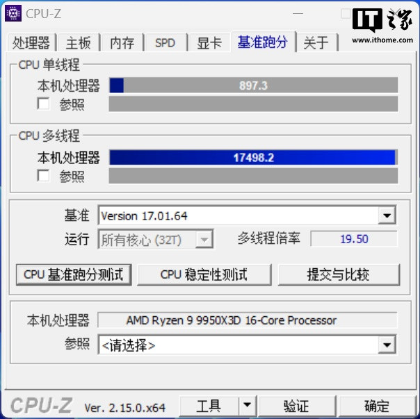 锐龙99950X3D处理器PBO模式下单线程得分897分,多线程得分17498分。