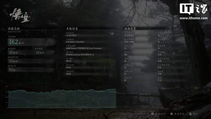 最后一款游戏《黑神话:悟空》,以1080P+高画质+100%TSR设置,运行游戏自带的基准测试,游戏平均帧数轻松来到162帧。
